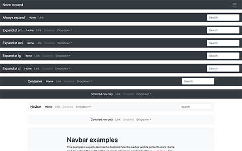 Demonstration of all responsive and container options for the navbar.